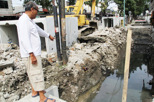 Warga menunjukan pipa air yang di potong saat pembangunan drainase di Jl. HM Joni Medan, Selasa (18/10). Warga di kawasan tersebut resah dan protes suplai air terputus di rumah mereka sejak Senin, sementara kemarin tidak ada pekerja yang melanjutkan pembangunan drainase dan pipa air tersebut. (wsp)