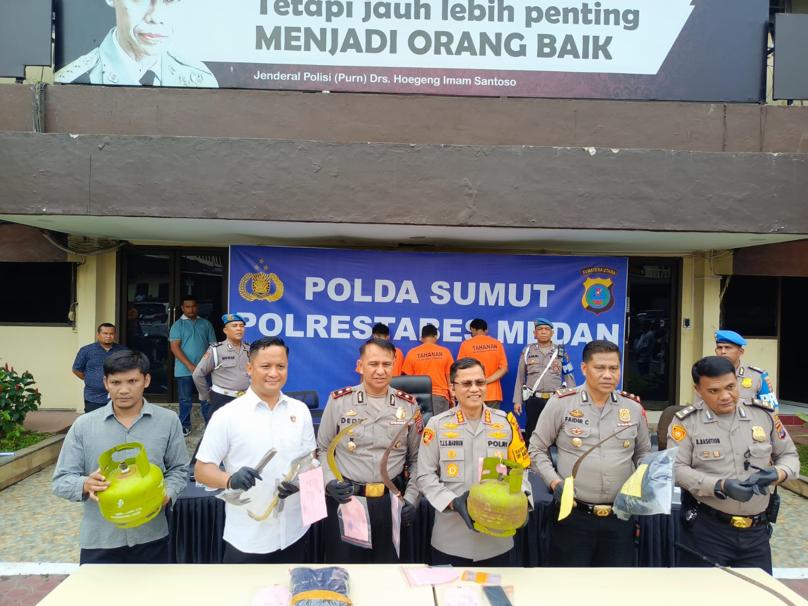 Berita Sore/Andi Aria Tirtayasa Kapolrestabes Medan Kombes Teddy Jhon Sahala Marbun didampingi Kasat Reskrim Kompol Jama Purba dan Kapolsek Patumbak Kompol Faidir Chan saat memperlihatkan sejumlah barang bukti dari penangkapan 15 bandit jalanan, Selasa (9/1/2024) di lapangan upacara Mapolrestabes Medan.