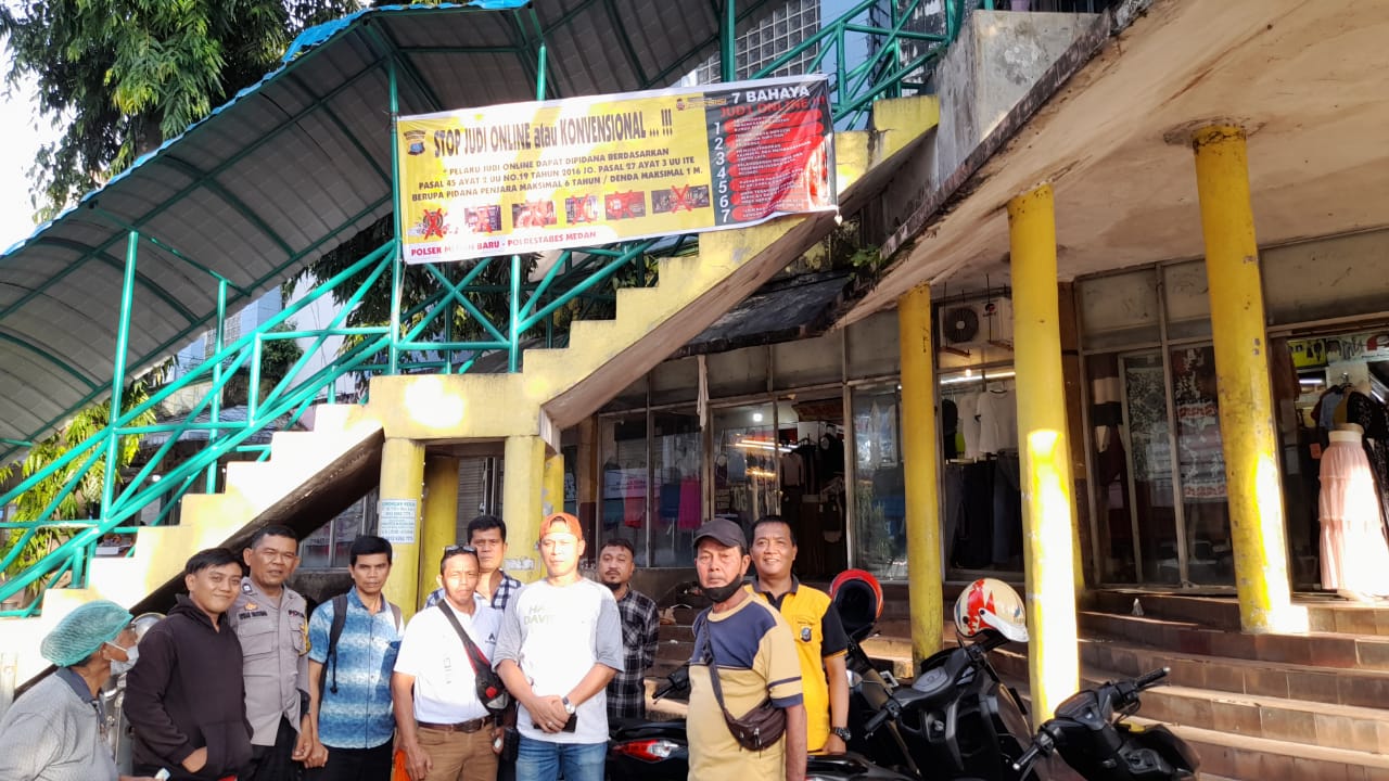 Wakapolsek Medan Baru AKP Carles Siregar foto bersama usai melaksanakan pemasangan spanduk imbauan larangan Judi online. Berita Sore/muslim lubis