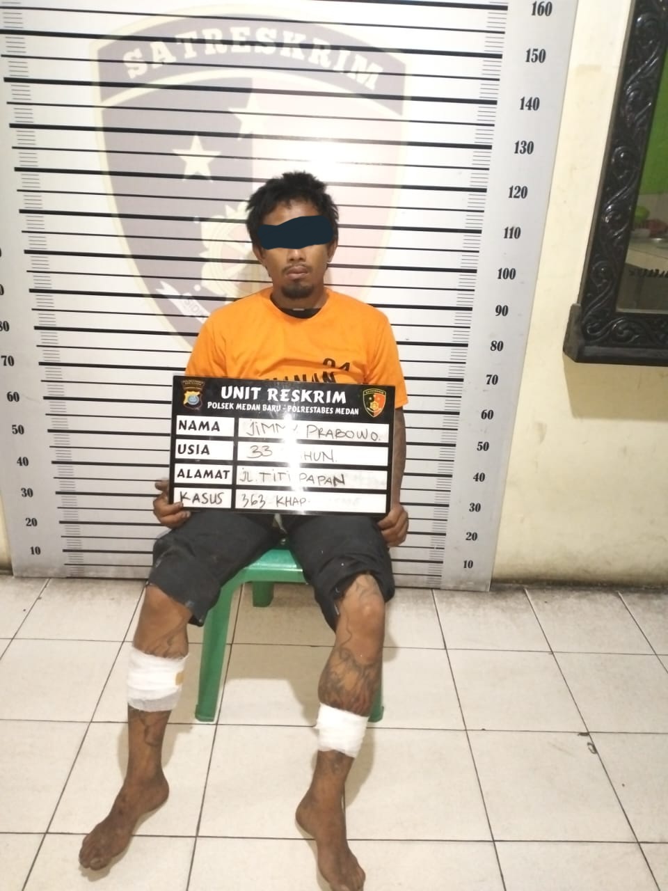 Kapolsek Medan Baru Kompol Yayang Rizki Pratama SIKyang di dampingi Kanit Reskrim AKP Harjuna Bangun mengatakan pelaku terpaksa di lakukan tindakan tegas dan terukur dengan menembak kakinya karena saat di lakukan penangkapan, pelaku melakukan penyerangan terhadap petugas dengan mengunakan sebilah pisau yang sebelumnya telah di selipkan di pinggang sebelah kiri pelaku selanjutnya pelaku di Evakuasi ke Rumah Sakit Bhayangkara guna mendapat perawatan medis.