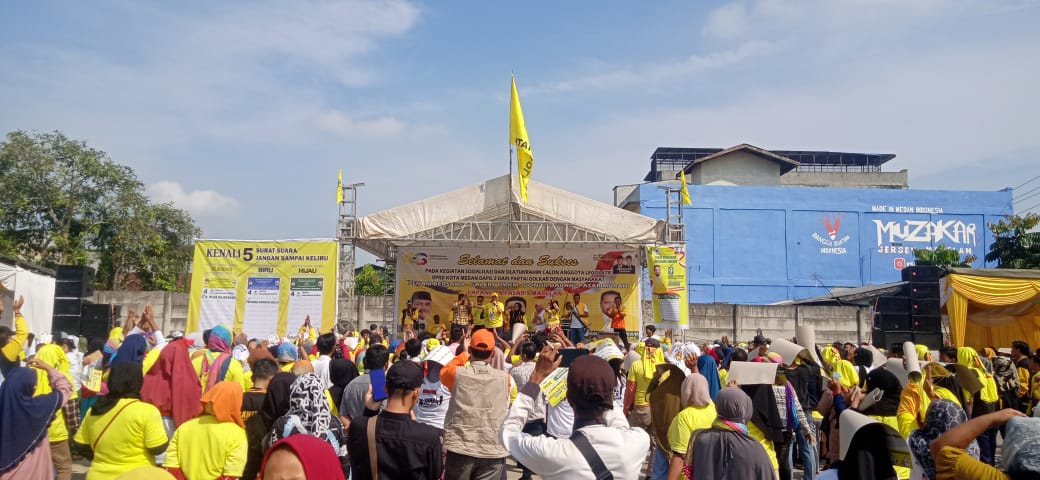 MEDAN (Berita): Ribuan masyarakat memadati lapangan eks Pekan Raya Marelan (PRM) di Jl. Marelan Raya, Kelurahan Tanah Enam Ratus, Kecamatan Medan Marelan, Minggu (4/2) sekira pukul 08:00 guna menghadiri kampanye calon anggota Legislatif Dapil 2 Kota Medan dari Partai Golkar Helmax Alex Sebastian Tampubolon SH, MH.