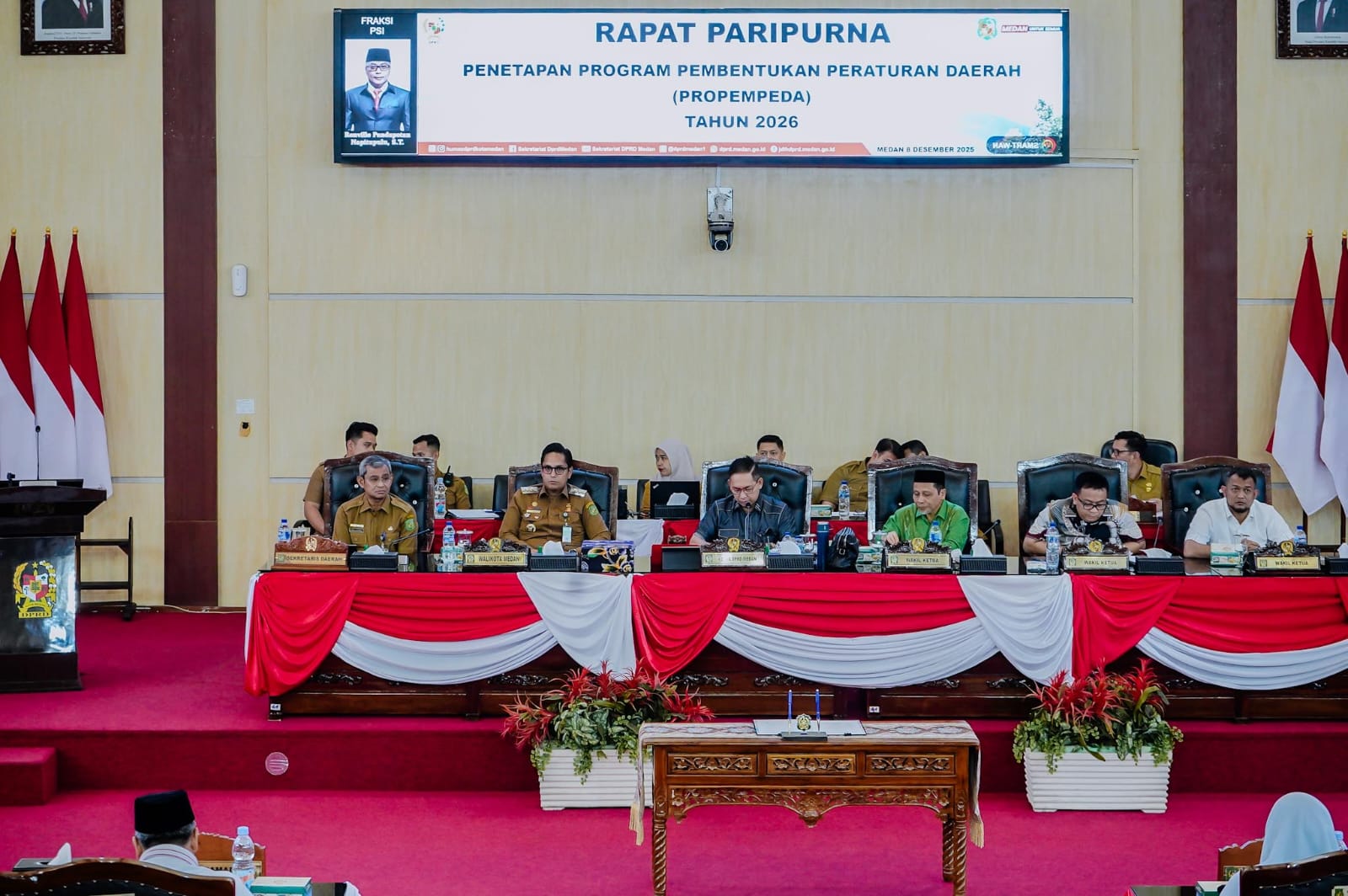 Rapat yang dipimpin Ketua DPRD Medan Wong Chun Sen tersebut menetapkan 10 Ranperda yang terdiri atas tiga Ranperda kumulatif terbuka terdiri atas pertanggungjawaban APBD 2025, perubahan APBD 2026, dan APBD 2027; tiga Ranperda usulan Pemko Medan mencakup pencabutan Perda Lembaga Kemasyarakatan, perubahan Pajak Daerah dan Retribusi Daerah,.