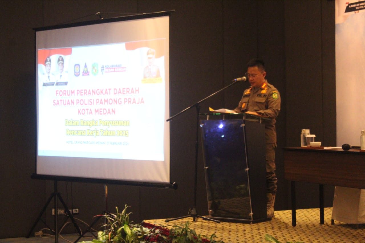 MEDAN (Berita): Satuan Polisi Pamong Praja (Satpol PP) Kota Medan menggelar Forum Perangkat Daerah dalam rangka penyempurnaan penyusunan rencana kerja Satpol PP Kota Medan tahun 2025 di Hotel Grand Marcure, Kamis (1/2).