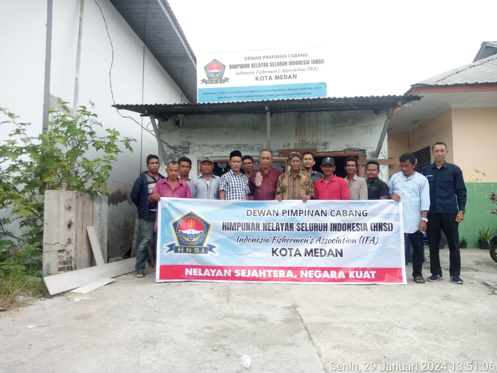 Berita Sore/Andi Aria Tirtayasa Ketua DPC HNSI Kota Medan Rahman Gafiqi SH foto bersama dengan para pengurus HNSI dan nelayan usai meresmikan Kantor Sekretariat DPC HNSI Kota Medan di Jalan Deli No 1-A Kelurahan Belawan I Kecamatan Medan Belawan, Senin (28/1/2024).