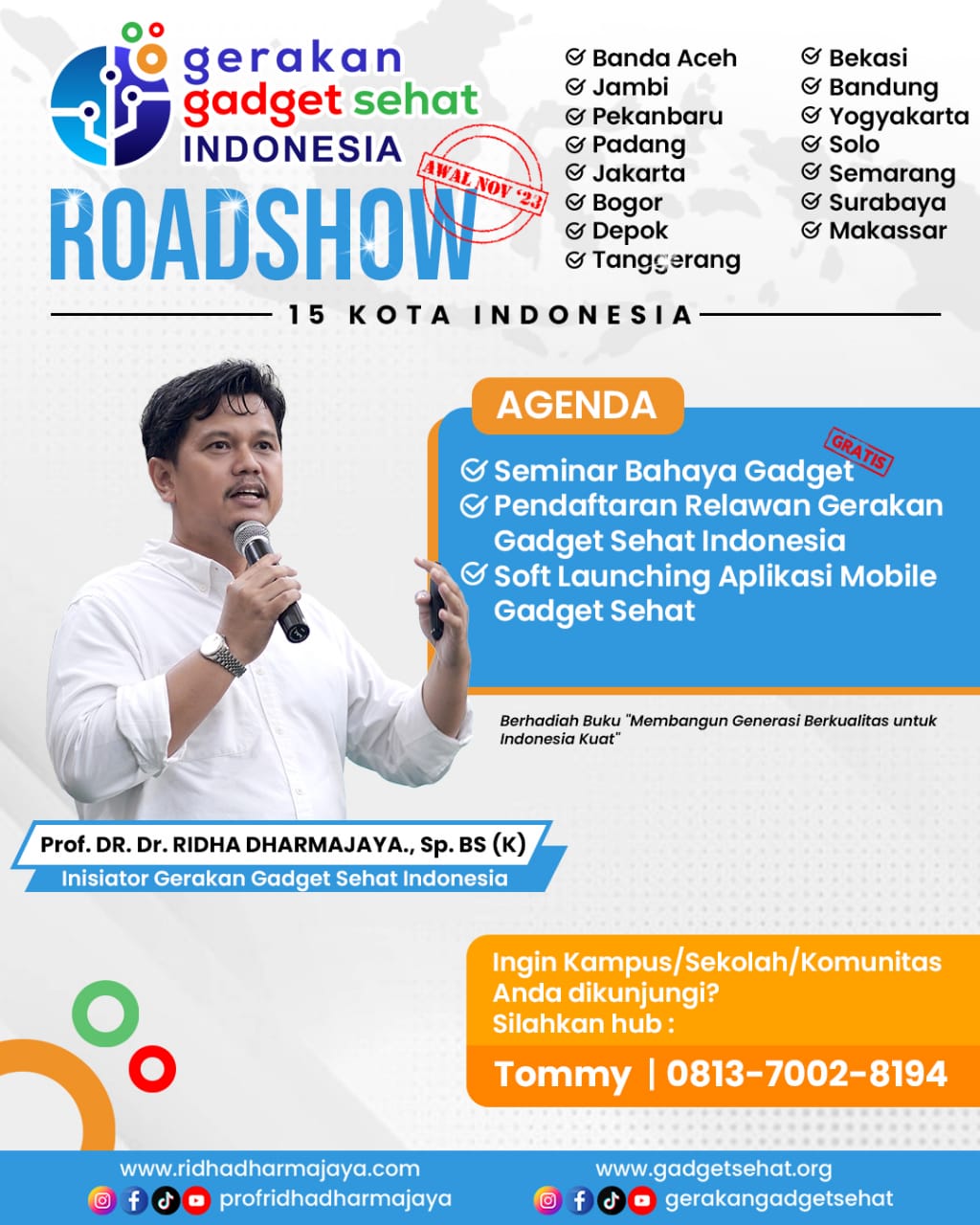 MEDAN (Berita): Gerakan Gadget Sehat Indonesia Prof.Ridha Dharmajaya berencana akan melakukan road show ke 15 kota di Indonesia. Ke 15 Kota tersebut adalah Banda Aceh, Jambi , Pekanbaru , Padang ,Jakarta, Bogor , Depok , Tangerang , Bekasi , Bandung, Yogyakarta , Solo, Semarang , Surabaya dan Makassar.