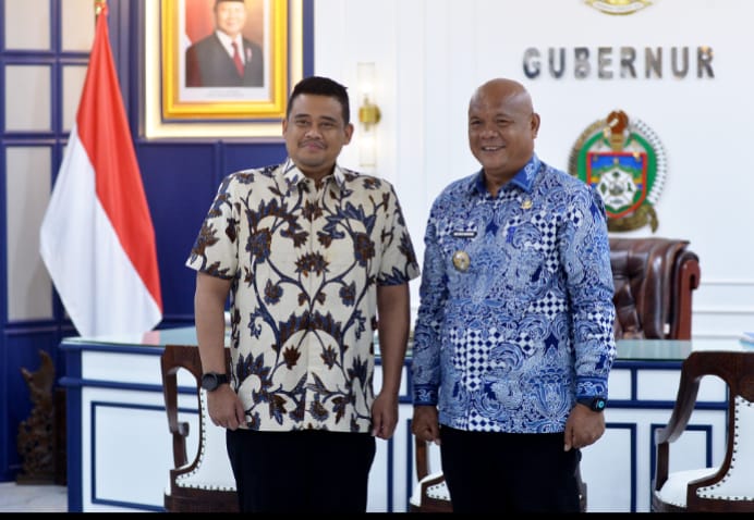 Gubernur Sumatera Utara (Sumut) Bobby Nasution menerima kunjungan kerja Bupati Nias Utara Amizaro Waruwu di Ruang Kerja Lantai 10 kantor Gubernur Sumut Jalan Diponegoro Kota Medan, Kamis (12/3/2026). Kunjungan tersebut membahas mengenai percepatan pembangunan di Kepulauan Nias. beritasore.co.id/ist