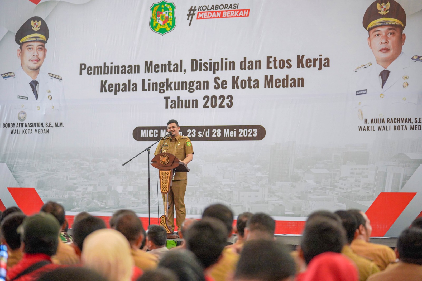 MEDAN (Berita): Ada tiga pesan penting yang disampaikan Wali Kota Medan Bobby Nasution ketika menghadiri Pembinaan Mental, Disiplin dan Etos Kerja Kepala Lingkungan (Kepling) Sekota Medan Tahun 2023 di Gedung Medan International Convention Centre Jalan Ringroad Medan, Selasa (23/5). Selain senantiasa menjaga keamanan dan kerukunan, kepling selaku ujung tombak Pemko Medan yang bersentuhan langsung dengan masyarakat juga harus mendukung pemberantasan narkoba serta mensukseskan lima program prioritas.