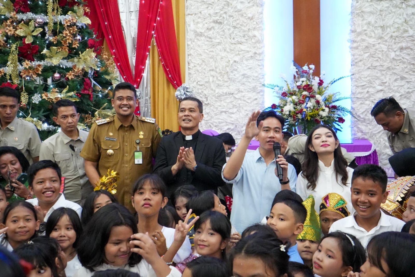 Setelah menyampaikan sambutan singkat, Gibran pun membagikan hadiah Natal. Pertama sekali yang mendapat hadiah Natal itu adalah anak-anak dan kemudian para remaja. Raut kegembiraan pun terpancar di wajah para anak dan remaja yang menerima hadiah itu.