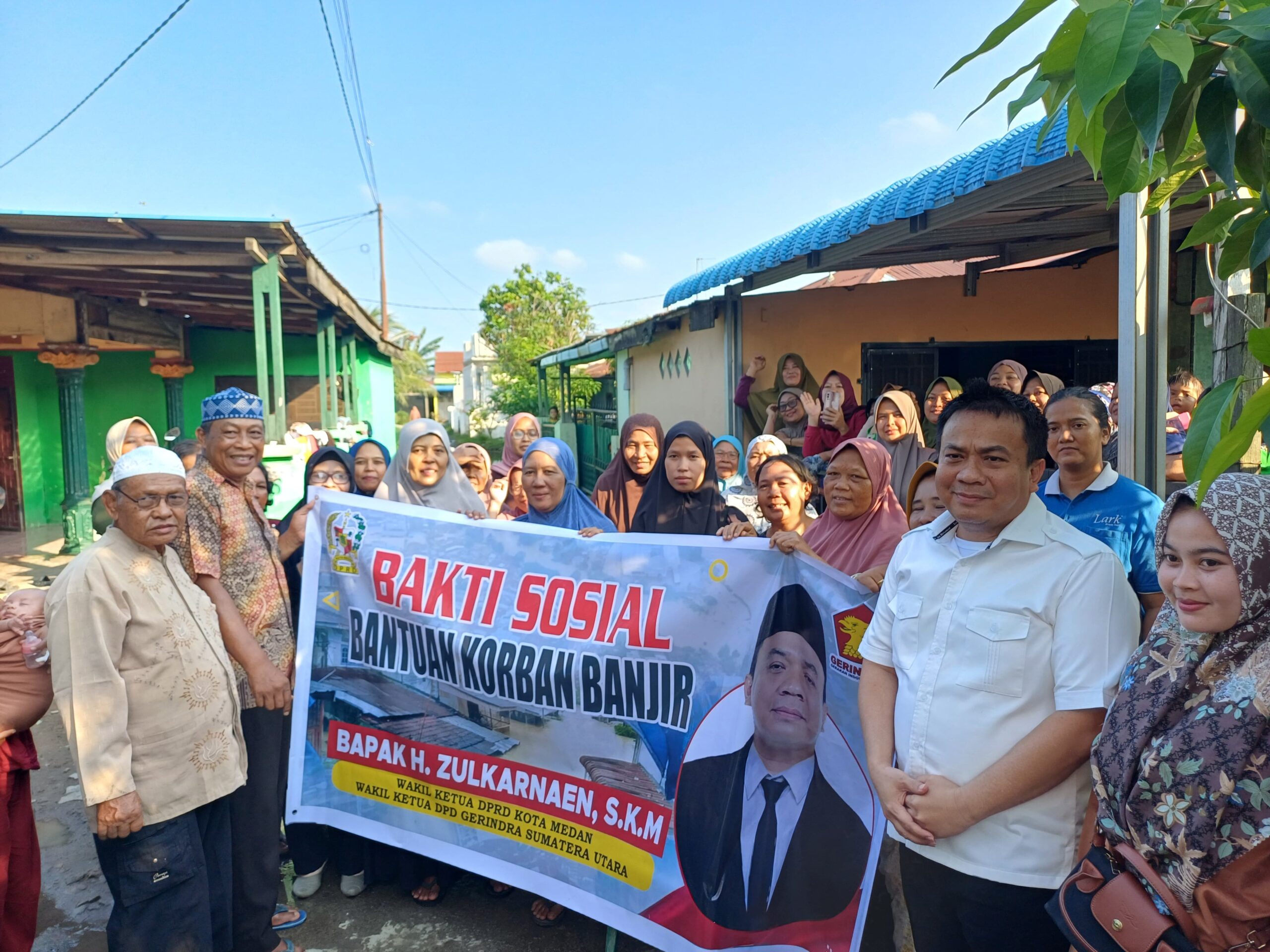 MEDAN (Berita) : Wakil Ketua DPRD Kota Medan dari Fraksi Partai Gerindra, H. Zulkarnaen S.K.M, menyerahkan bantuan bahan pangan kepada warga Kota Medan yang terdampak banjir. Bantuan tersebut diberikan Zulkarnaen kepada ratusan warga di tiga lokasi pada Senin (1/12/2025).