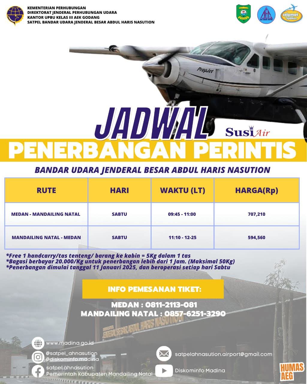 Sebagai informasi tambahan, tipe pesawat yang beroperasi ini adalah Cessna Grand Caravan berkapasitas 10 penumpang dengan harga tiket Medan-Madina sebesar Rp 707.210. Madina-Medan Rp 594.560. Sementara biaya bagasi, gratis untuk 1 handcarry/tas tenteng/barang ke kabin seberat 1 sampai 15 Kg. Bagasi berbayar sebesar Rp 20.000 per Kg untuk penerbangan kurang dari 1 jam (maksimal 50 Kg). (cah)
