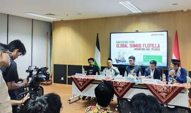 Konferensi Pers Global Sumud Flotilla Nusantara Sail to Gaza yang berlangsung di Jakarta, Jumat (15/8/2025). (ant)