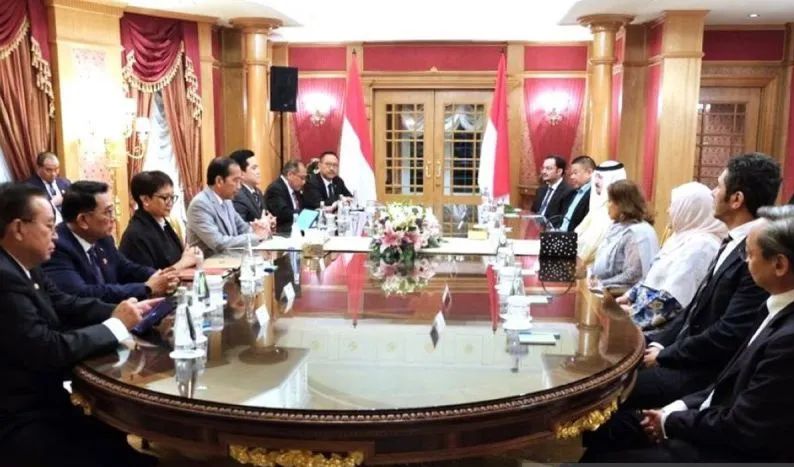 Sementara itu Presiden Jokowi didampingi Kepala Staf Kepresidenan Moeldoko, Menteri Luar Negeri Retno Marsudi, Menteri BUMN Erick Thohir, Kepala IKN Bambang Susantono, anggota Dewan Pertimbangan Presiden (Wantimpres) Gandi Sulistiyanto Suherman dan Dubes Ubaedillah.