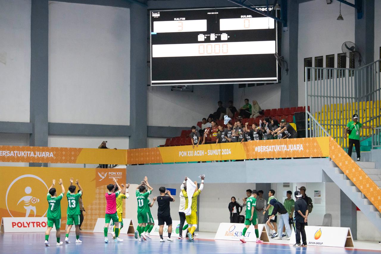DELISERDANG (Berita): Tim futsal Putra Kalimantan Timur (Kaltim) kembali tampil maksimal, dengan berhasil meraih poin sempurna di babak penyisihan grup. Tim Kaltim membungkam 3 gol tanpa balas Sulawesi Selatan di GOR futsal Dispora, Jalan William Iskandar, Sabtu jelang malam, (31/8/2024).