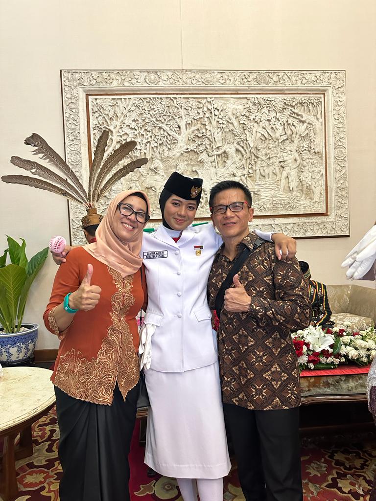 Teks. Davina Anis Raisha bersama kedua orangtuanya, Iptu Heri Suhartono,SH dan Aiptu Neneng Heriani Suryana SE, usai melaksanakan tugas sebagai Paskibraka di Istana Negara. Ist
