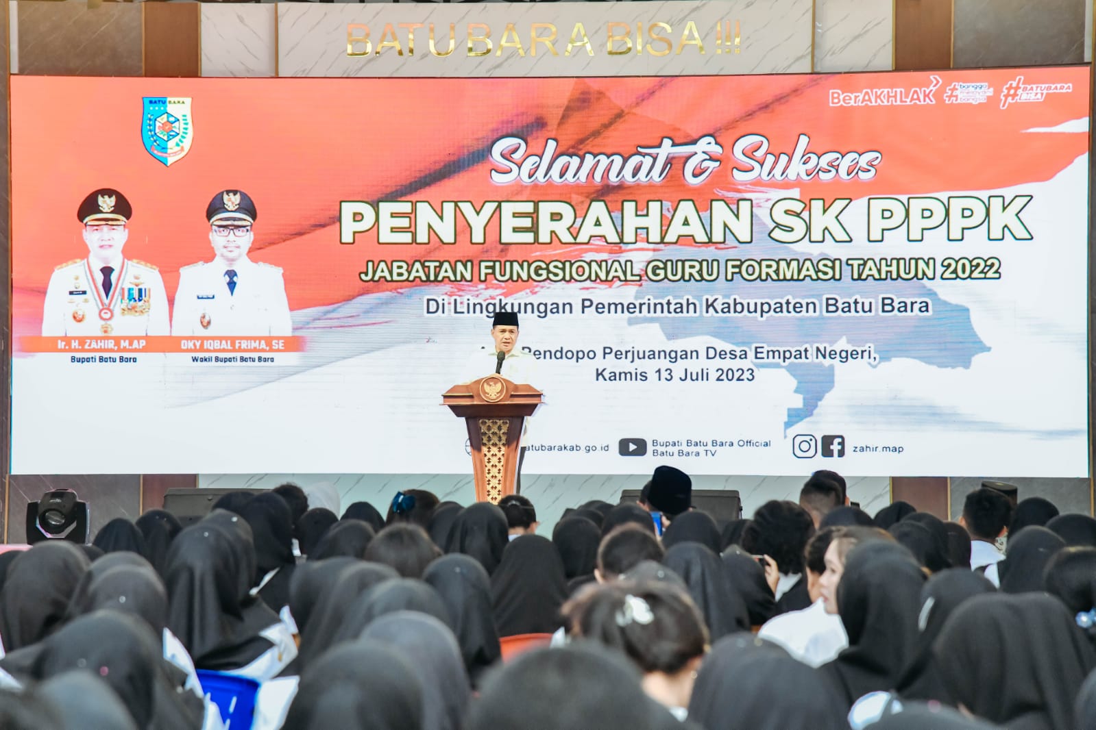 Bupati Batu Bara Ir.H Zahir M.AP serahkan 410 SK Pegawai PPPK di Pendopo Perjuangan Desa Empat Negeri Kecamatan Datuk Lima Puluh, Kamis (13/07/2023). beritasore/alirsyah