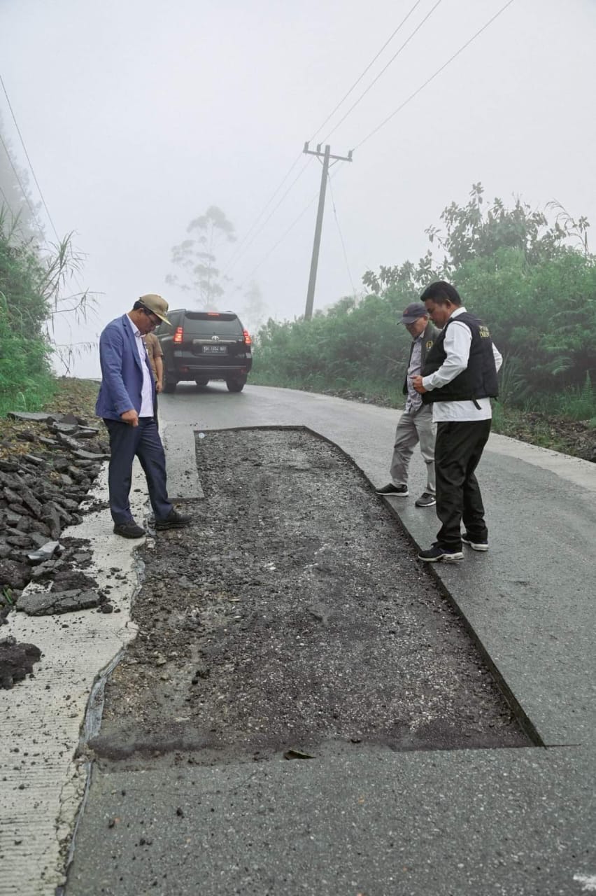 DOLOKSANGGUL (Berita): Pastikan kualitas, Bupati Humbang Hasundutan (Humbahas), Dosmar Banjarnahor didampingi beberapa Pimpinan Organisasi Perangkat Daerah (OPD) monitor proses pembangunan jalan kabupaten yang menghubungkan Doloksanggul-Parlilitan yang menelan biaya Rp 9.718.441.300.