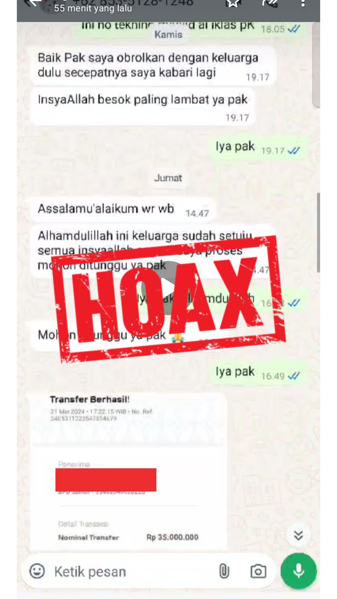 Namun, setelah melakukan komunikasi ulang untuk menyampaikan hal tersebut, nomor pelaku mendadak tidak dapat dihubungi.