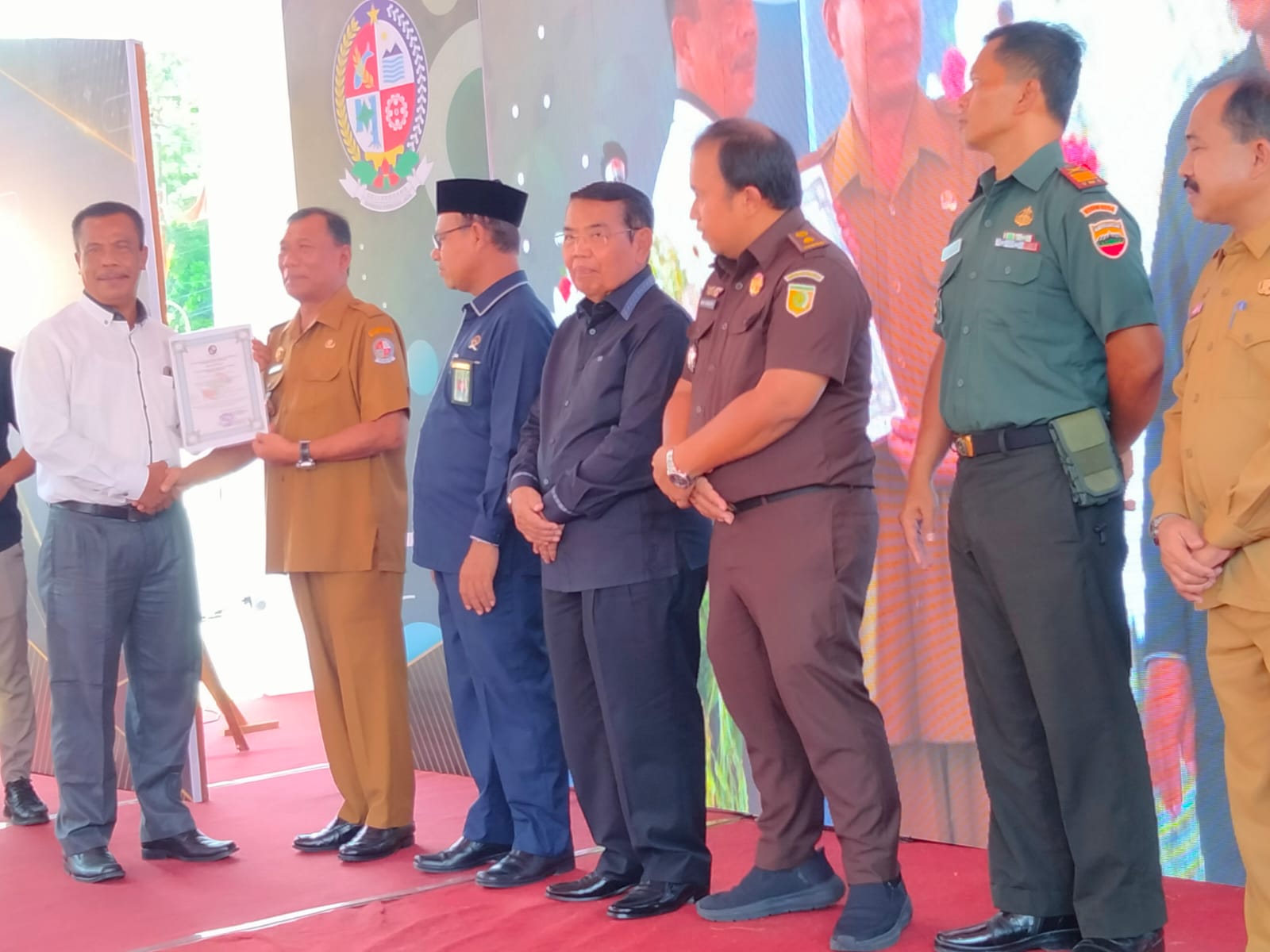 Teks foto : BUPATI Deliserdang H.Ashari Tambunan menyerahkan sertifikat hasil pemeriksaan kesehatan Koperasi kepada Sekretaris Koperasi Konsumen Pusat Pegawai Republik Indonesia Kabupaten Deliserdang Drs.Parulian Daulay, MPd, pada peringatan hari Koperasi ke 76 dan FKM ke 3 Tahun 2023 di pelataran Plaza Kuliner Deliserdang, Senin (28/8).- (Berita/Khairul K Siregar)