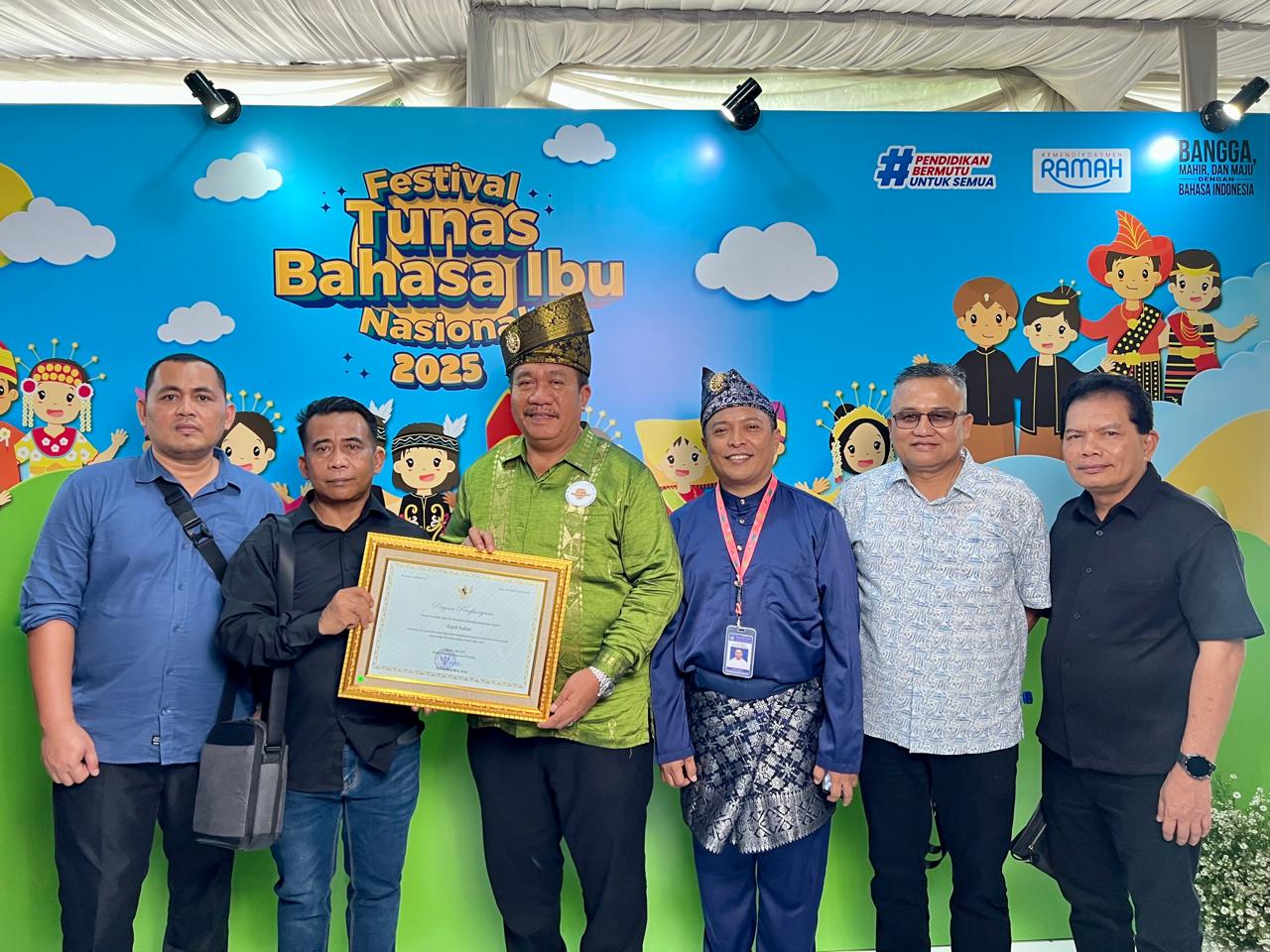Penghargaan tersebut diserahkan langsung oleh Menteri Pendidikan Dasar dan Menengah, Prof. Dr. Abdul Mu’ti, M.Ed dalam acara Festival Tunas Bahasa Ibu Nasional (FBIN) Tahun 2025 yang berlangsung di Gedung Merah Putih, Bojongsari Depok provinsi Jawa Barat pada Senin, (26/05/ 2025).