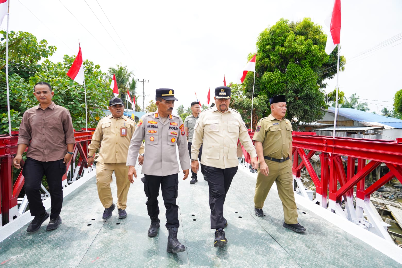 Bupati Batubara H Baharuddin Siagian, SH, MSi didampingi Kapolsek Medang Deras AKP AH Sagala menghadiri Launching 218 Jembatan Garuda dilaksanakan Kepala Staf Angkatan Darat (Kasad) secara daring dari lokasi pembangunan Jembatan Bailey Desa Sei Buah Keras, Kecamatan Medang Deras, Kabupaten Batubara Senin (9/3/2026). beritasore.co.id/alirsyah