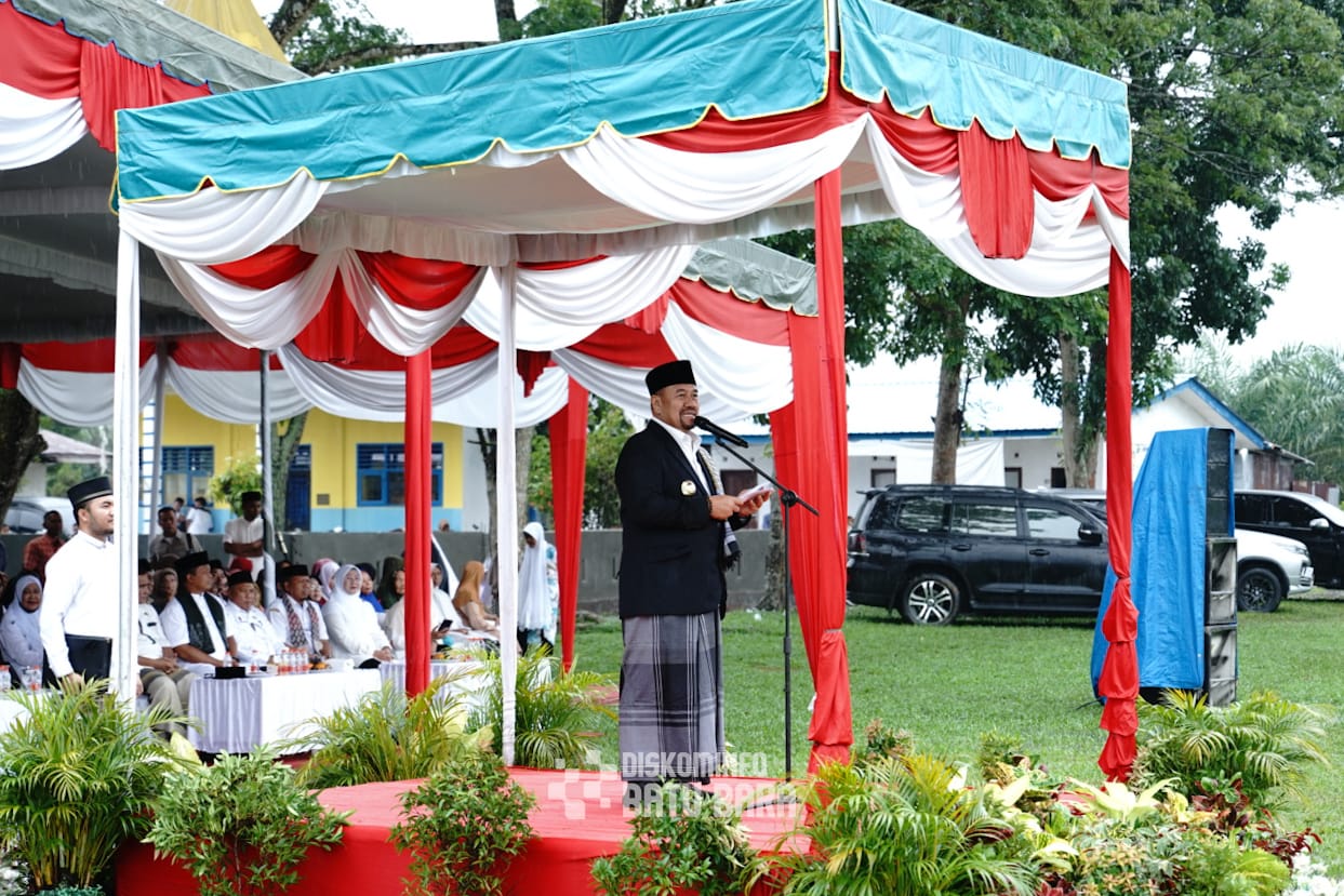 BATUBARA (Berita): Bupati Batubara H Baharuddin Siagian, SH, MSi memimpin Upacara Hari Santri di bawah rintik-rintik hujan, di Lapangan Bola Kaki Sei Bejangkar, Rabu (22/10/2025).