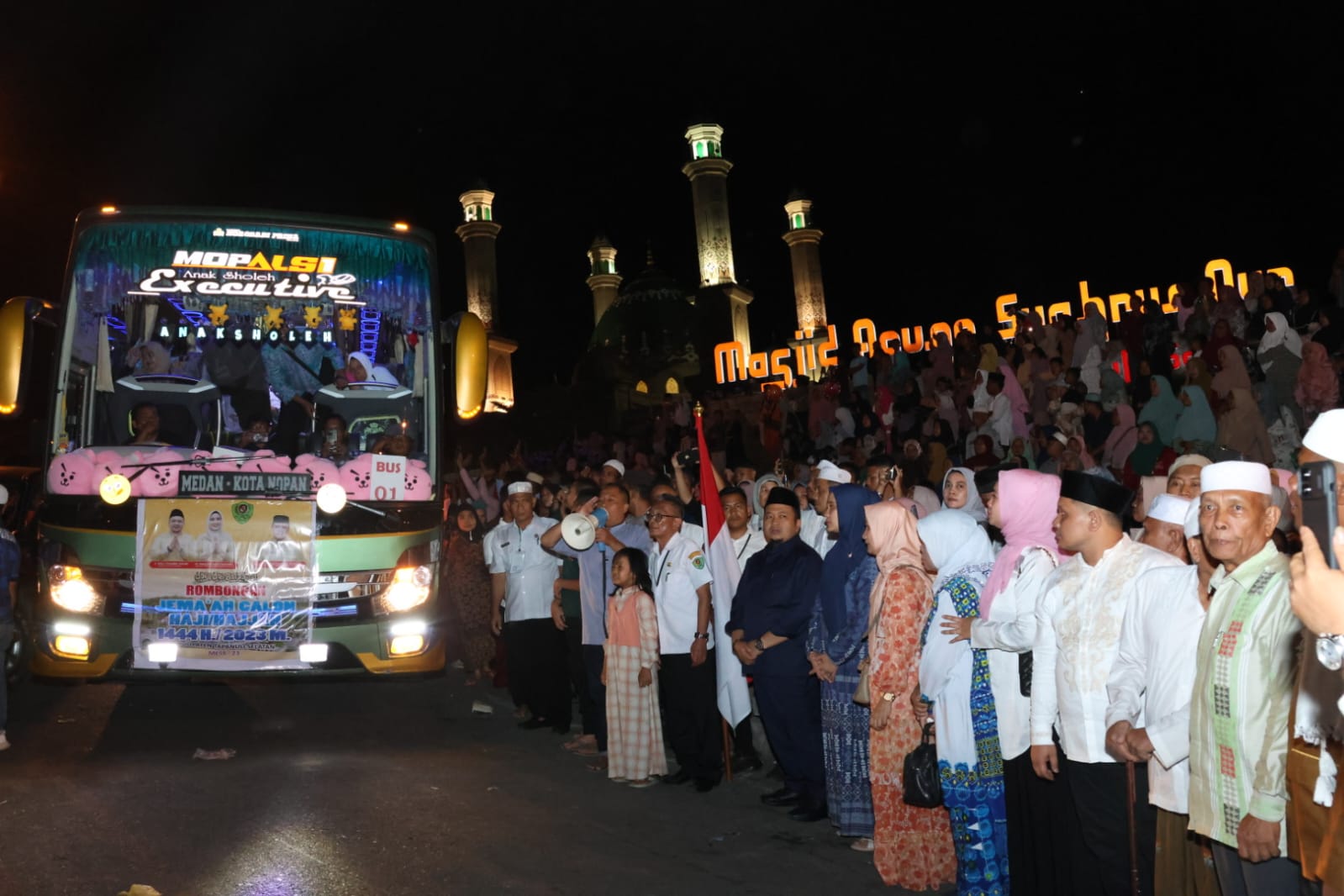 Bupati Dolly Pasaribu dan Ketua Tim Penggerak Pemberdayaan dan Kesejahteraan Keluarga (TP. PKK) berangkatkan 188 Jamaah Calhaj Tapsel dari Masjid Syahrun Nur Sipirok menuju Asrama Haji Medan. beritasore/Ist