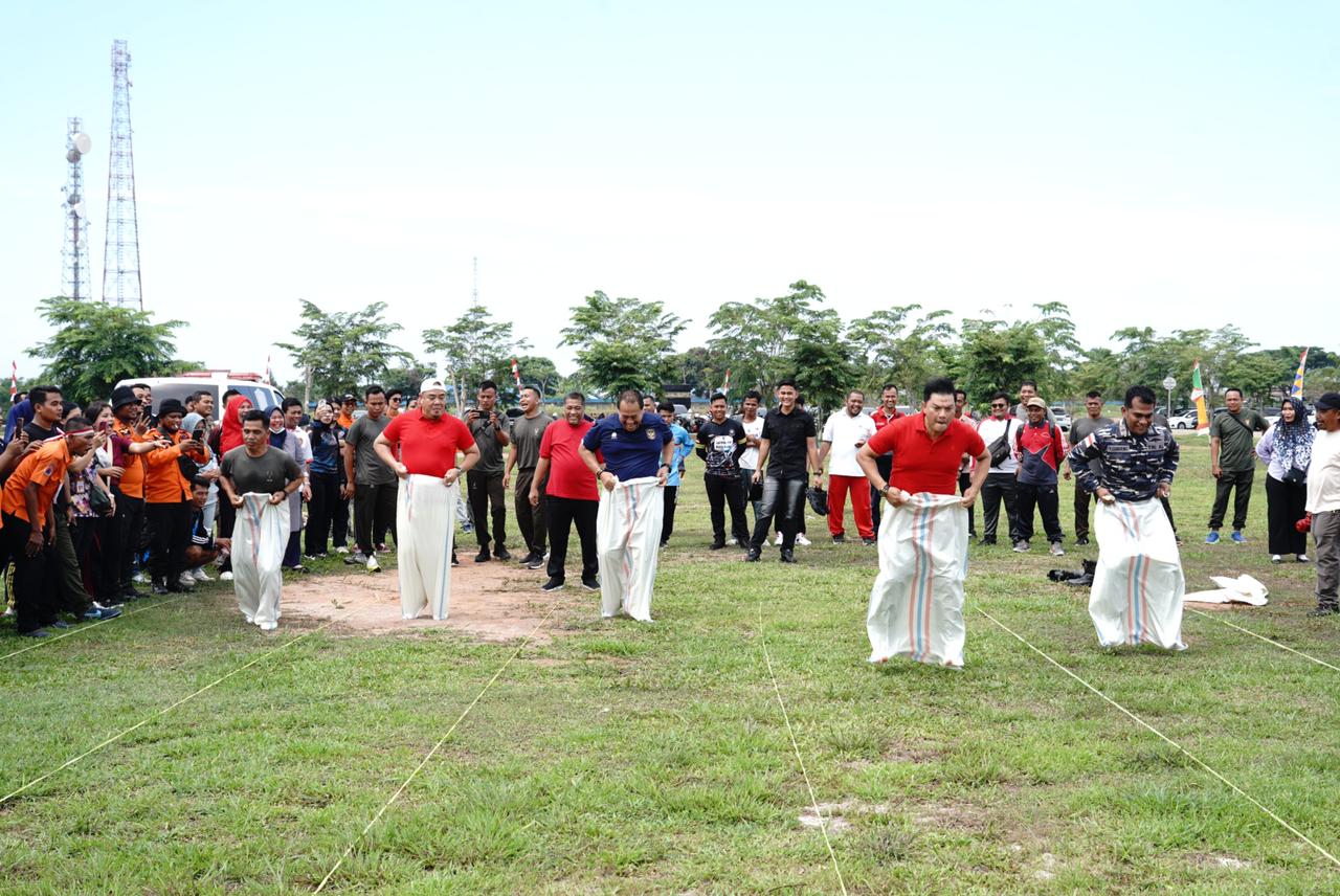 Bupati Batubara H Bahariddin Siagian SH, MSi dan Wakil Bupati Syafrizal SE, MAP ikut lomba karung goni, memeriahkan HUT ke 80 RI di Lapangan Kantor Bupati Batu Bara, Kecamatan Lima Puluh Kamis (14/8/2025). Berita S ore/alirsyah