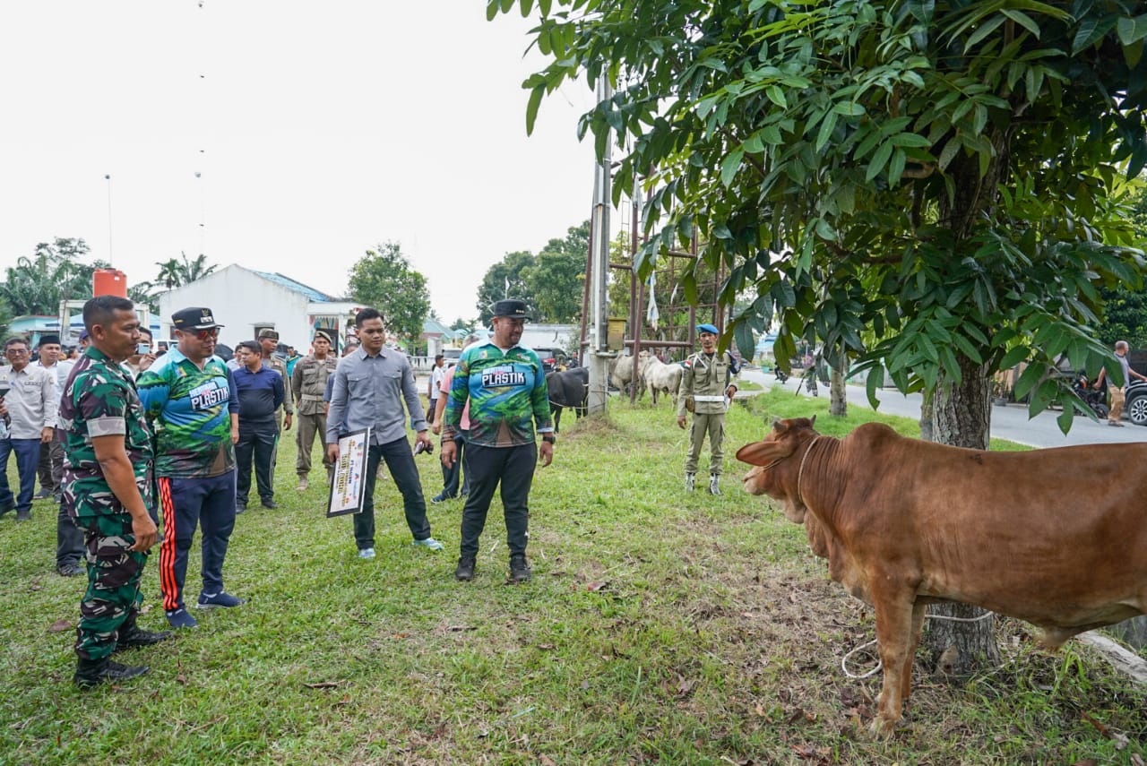 BATUBARA (Berita): Menjelang Hari Raya Idul Adha 1446 Hijriyah, Bupati Batu Bara Baharuddin Siagian, SH, M.Si bersama Wakil Bupati Syafrizal, SE, M.Si menyerahkan 41 Hewan Kurban kepada masyarakat secara simbolis di Lapangan, Blok 8, Kecamatan Lima Puluh Kamis (05/06/2025).