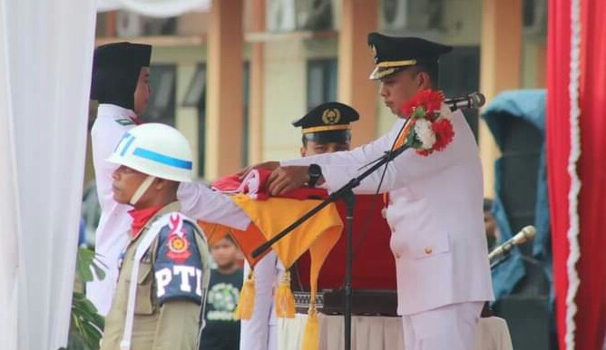 Teks Foto : Bupati Paluta Andar Amin Harahap, S.STP., M.Si. memberikan Bendera Merah Putih Kepada Paskibra Untuk dikibarkan.
