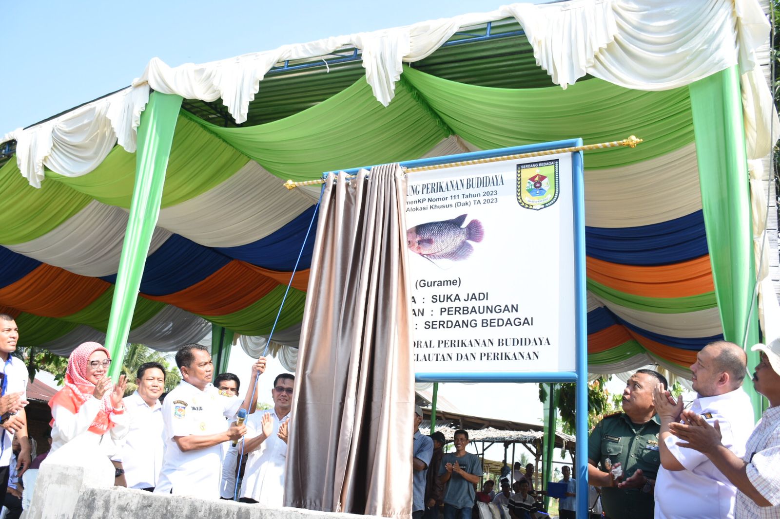 SERGAI (Berita): Bupati Serdang Bedagai, H. Darma Wijaya. menyerahkan bantuan sarana dan prasarana pemberdayaan usaha pembudidaya ikan skala kecil sekaligus peresmian Kampung Budidaya Gurame di Desa Suka Jadi, Kecamatan Perbaungan, Rabu (9/8/2023).