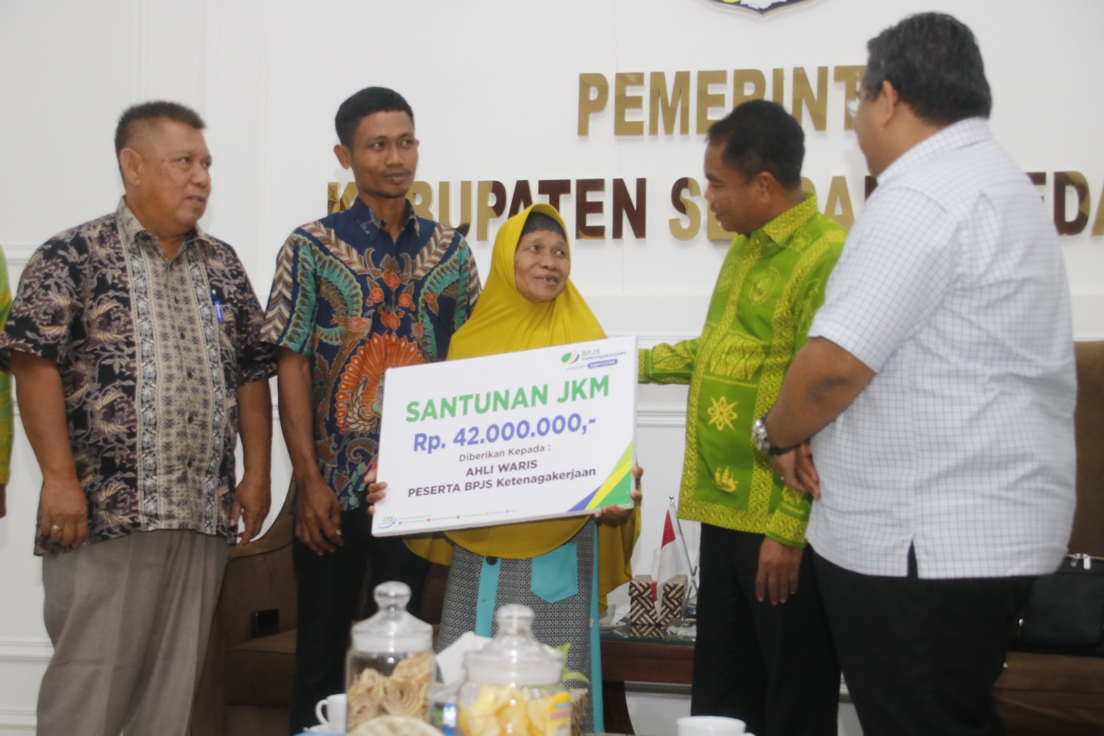 SERGAI (Berita): Bupati Serdang Bedagai, H. Darma Wijaya menyerahkan pembayaran program Jaminan Kematian BPJS Ketenagakerjaan kepada ahli waris warga Desa Silau Rakyat yang merupakan pekerja insentif, di Kantor Bupati Sergai, Sei Rampah, Jumat (08/09)