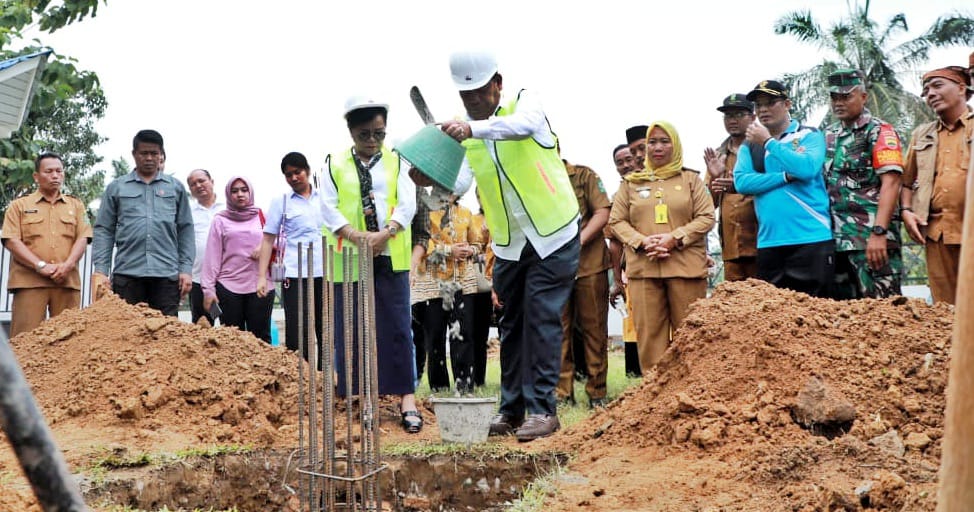 SIMALUNGUN (Berita): Bupati Simalungun Radiapoh Hasiholan Sinaga dampingi Ketua TP PKK Ny Ratnawati Radiapoh Hasiholan Sinaga melakukan peletakan batu pertama pembangunan Ruang Kelas Baru (RKB) SMP Negeri 1 Gunung Maligas, Simalungun, Sumut, Senin (23/9/2024).