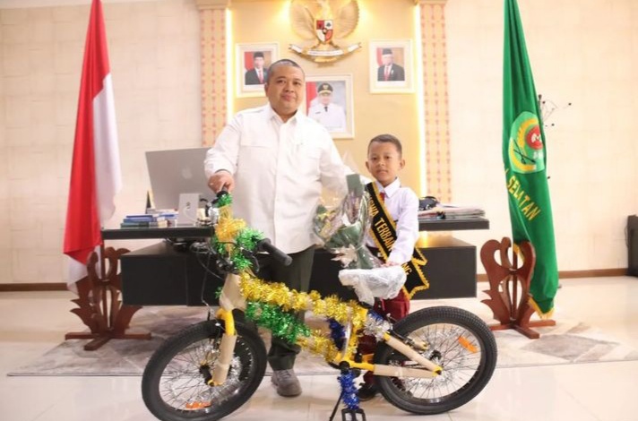 TAPSEL (Berita): Bupati Tapanuli Selatan, Dolly Pasaribu memberikan hadiah surprise sepeda kepada Teguh Pria Sandi, bocah kelas IV SD Negeri 100613 Pasar Lama, Kec.Batang Angkola usai bocah ini bertemu dengan Presiden RI, Djoko Widodo baru-baru ini.