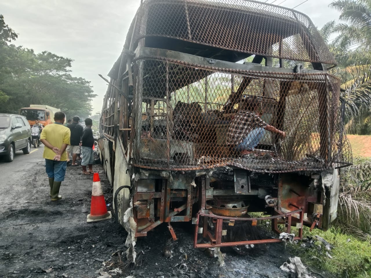ASAHAN (Berita): Sebuah bus penumpang PT RAPI BK 7611 DO yang dikemudikan marga Bukit, datang dari arah Rantau Prapat menuju Medan terbakar di KM MDN 250 kawasan Jalinsum Simpang Tunggul, Kecamatan Pulau Rakyat, Kabupaten Asahan, Jumat (24/10/2025).