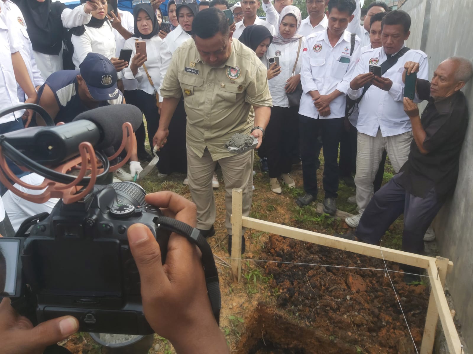 Ketua DPW BRNR Sumut Kolonel (Purn) Joko Suparyanto meletakkan batu pertama pembangunan dapur umum MBG di Lingkungan Krida Kelurahan Brandan Timur Baru Kecamatan Babalan, Langkat, Minggu (3/8/2025). Berita Sore/Boy Aprizal.