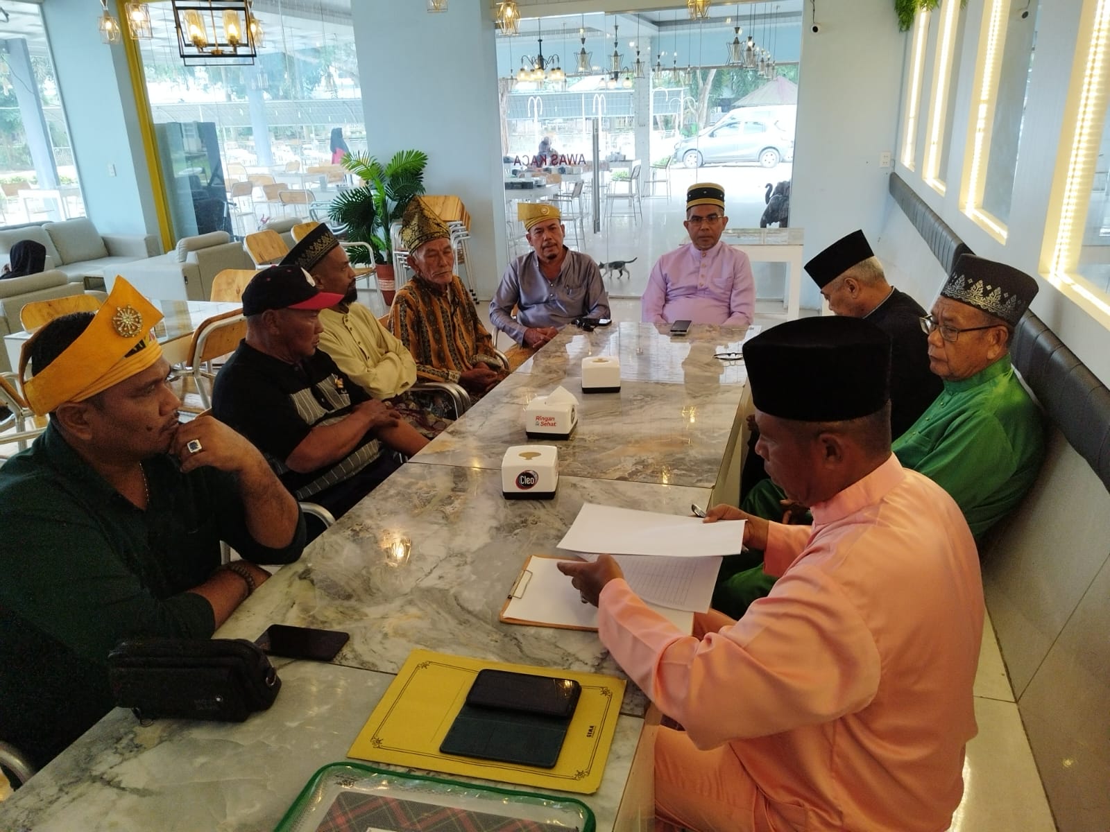 Yang Dipertuan Majelis Kerapatan Masyarakat Adat Melayu Kedatukan Negeri Batubara (MKMAMKNB) YM.Dato’ Mohd Zaki menggelar rapat konsolidasi jadwal pelantikan di Ball Room Kopi TM 100 Jalinsum Medan Kisaran Desa Sipare pare Kecamatan Air Putih Kabupaten Batu Bara Rabu (19/2/2025).