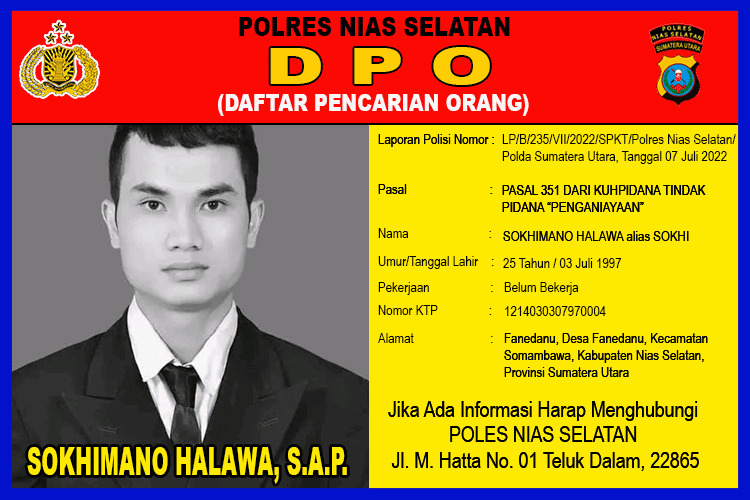 Atas peristiwa tersebut, Adizomasi Harefa sebagai keluarga yang sadar hukum melaporkan Sokhimano Halawa sebagaimana laporan Polisi Nomor: LP/B/235/VII/2022/SPKT/POLRES NIAS SELATAN / POLDA SUMATERA UTARA, tanggal 7 Juli 2022. Pelaku diduga melanggar Pasal 351 dari KUHPidana tindak pidana penganiayaan. Hal ini termuat dalam daftar pencarian orang (wanted people) Nomor: DPO/22/IX/RES.1.6/2022/Reskrim. (mhs)