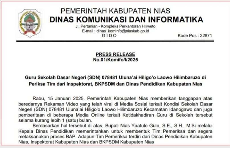 Seperti dikutip dari Dinas Kominfo Kabupaten Nias, Disampaikan Bupati bahwa, mulai hari ini Rabu 15 Januari 2025 Tim pemeriksa telah memanggil guru-guru yang bertugas di sekolah tersebut sebanyak 5 orang dan saat ini sedang menjalani proses pemeriksaan di Dinas Pendidikan Kabupaten Nias. Ungkapnya
