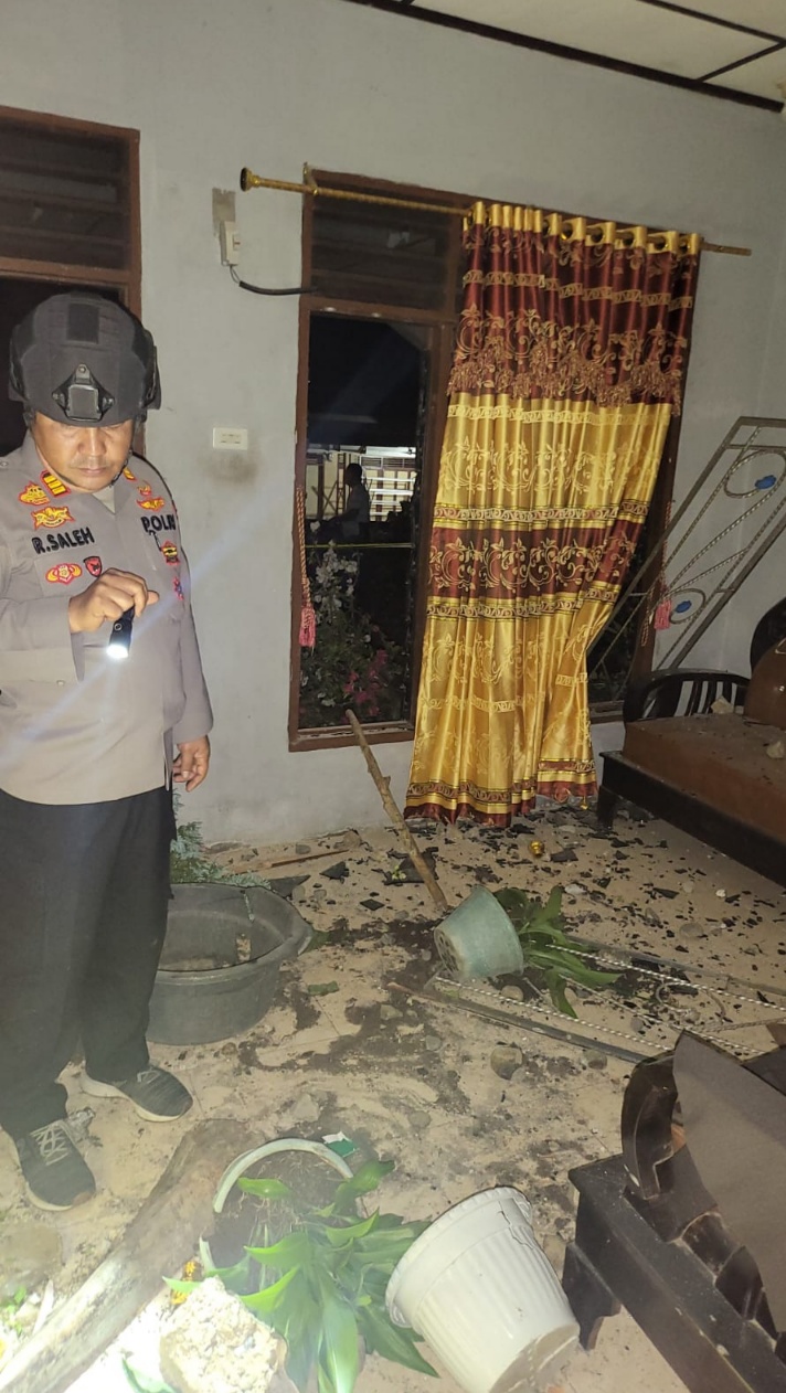 Kapolsek Batang Angkola, AKP Raden Saleh, SH, saat meninjai rumah AN korban pengerusakan rumah di Desa Sisoma Kec.Tano Tombangan Angkola (Tamtom) Kab.Tapsel, Sabtu (4/3) Malam.beritasore/Birong RT