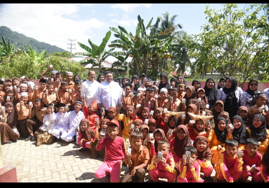 TAPSEL (Berita): Bupati Tapanuli Selatan Dolly Pasaribu membagikan susu gratis bagi siswa SDN 101112 Sipange Kec.Sayur Matinggi guna mendorong semangat belajar siswa, Jumat (17/5/2024).