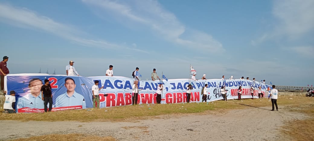 Harapan baru itu ada di (02) Prabwo-Gibran kata M.Adam Malik S,Sos.Menjawab Berita, M. Adam Malik S,Sos membentangkan Spanduk di pantai Citra Kwala Tanjung bertuliskan