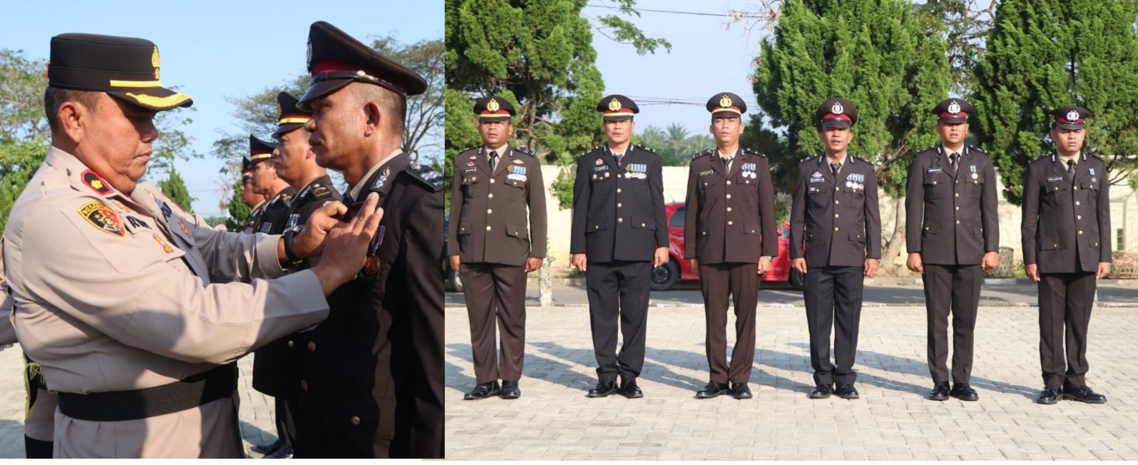 Wakapolres Serdang Bedagai Kompol Dr Rudy Candra, SH., MH, menyematkan Satya Lencana kepada enam orang anggota Polres Serdang Bedagai di Mako Polres Sergai, Rabu,28 Januari 2026. beritasore.co.id/Azwen