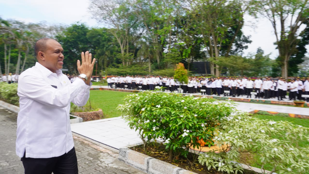 Sebelum menyampaikan pidato Pj. Bupati Langkat mengajak para peserta apel agar semangat dengan mengucapkan yel yel.