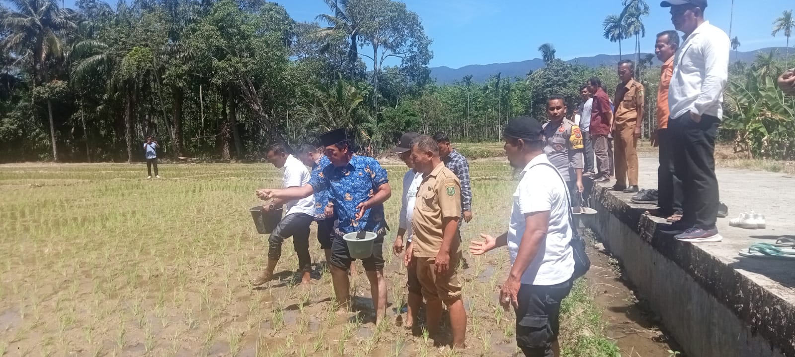 Usai memastikan harga pupuk bersubsidi sesuai HET di wilayah itu, Plt Kadis Pertanian bersama masyarakat dan para ketua kelompok tani melaksanakan penaburan pupuk ke salah satu sawah warga di desa tersebut.