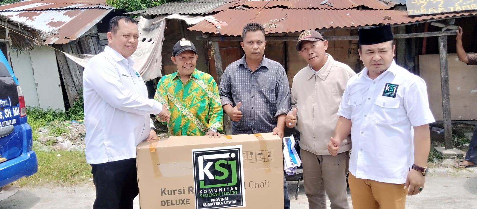 Turut hadir Jefri Amnil SE Ketua KSJ Kabupaten Batu Bara ,Alirsyah Ketua KSJ Kecamatan Nibung Hangus, pada acara penyerahan korsi roda kepada Ruslan yang disapa Pak Uban (65) yang lumpuh warga Desa Tanjung Mulia Kecamatan Nibung Hangus, Rabu (11/10-2023).