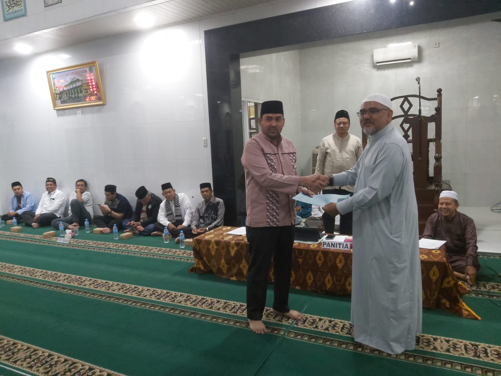 Ketua BKM Ubudiyah P Brandan terpilih H Syahrum Hakim (kanan) menyerahkan surat visi misi kepada Ketua Panitia Pemilihan Syafriansyah Nasution, di Masjid Ubudiyah P. Brandan, Rabu(30/7/2025). Berita Sore/Boy Aprizal.