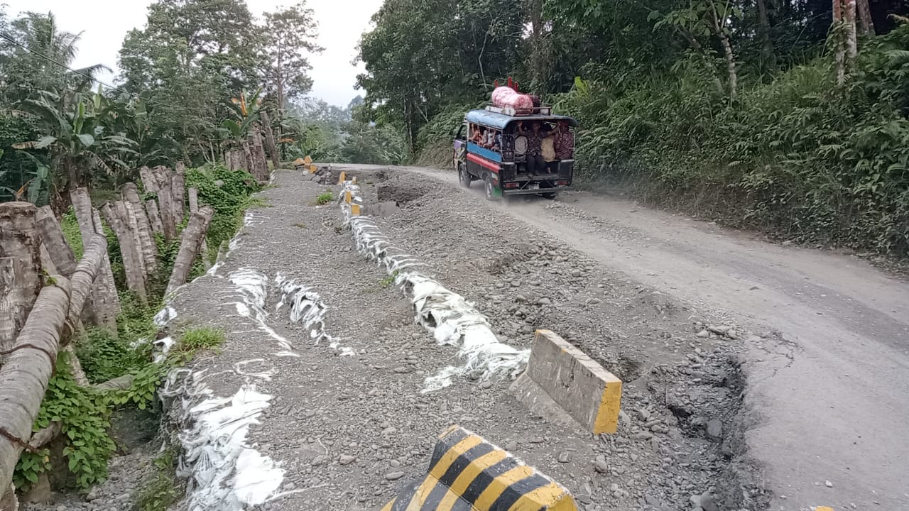 Pantauan dilapangan, Kamis (5/10) terlihat setengah badan jalan sudah ambles. Terlihat tembok penahan sementara di sisi jalan telah dipancang batang kelapa agar tanah tidak semakin ambles. Kendaraan yang lewat mesti ekstra hati hati dan antri menghindari kecelakaan lalu lintas.
