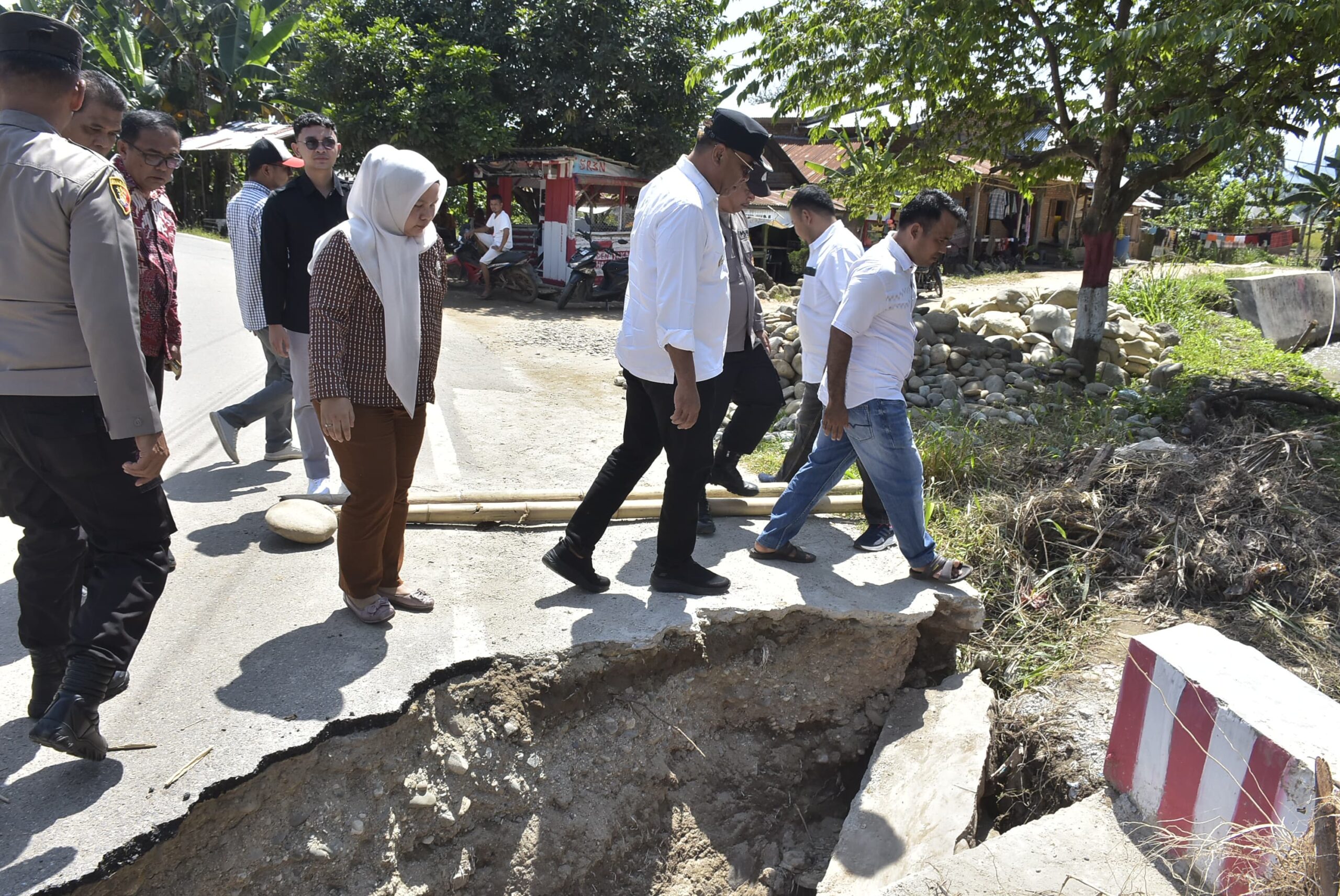 MADINA (Berita): Bupati Mandailing Natal (Madina) HM Jafar Sukhairi Nasution didampingi Asisten I Sahnan Pasaribu dan Kepala Dinas Pekerjaan Umum dan Penataan Ruang (PUPR) Ir. Elpi Yanti Harahap meninjau jembatan yang nyaris ambruk di Desa Tambiski Nauli, Kecamatan Naga Juang, Sabtu, (28/12).