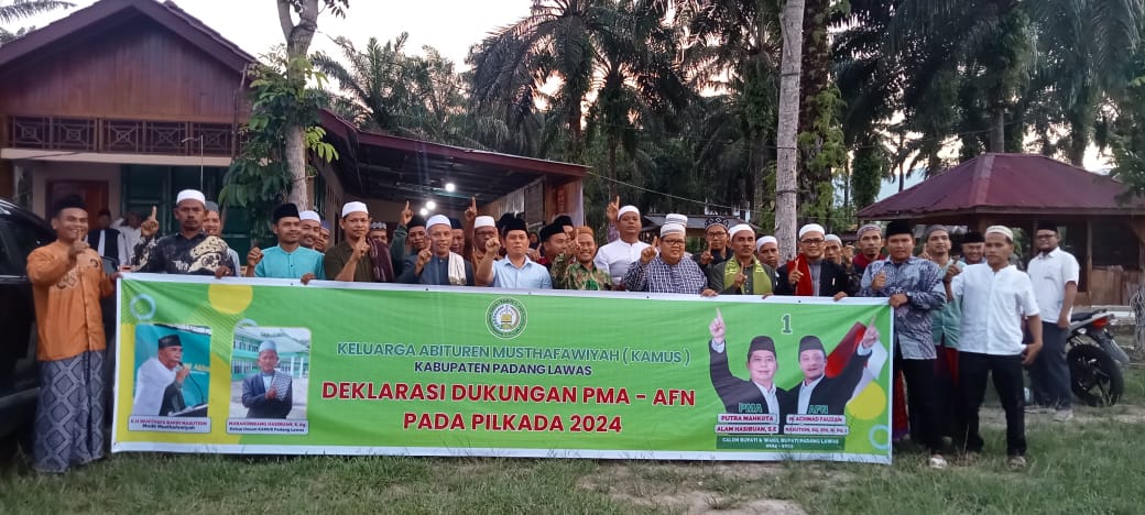 PALAS (Berita): Para Ulama dan Tuan-tuan Guru yang tergabung dalam Keluarga Besar Abituren Musthafawiyah (KAMUS) Kabupaten Padanglawas (Palas), siap memenangkan Paslon Bupati dan Wakil Bupati Palas nomor urut 1, Putra Mahkota Alam Hasibuan SE dan Achmad Fauzan Nasution M.Pdi pada Pilkada serentak 27 November 2024, Rabu (23/10/2024).