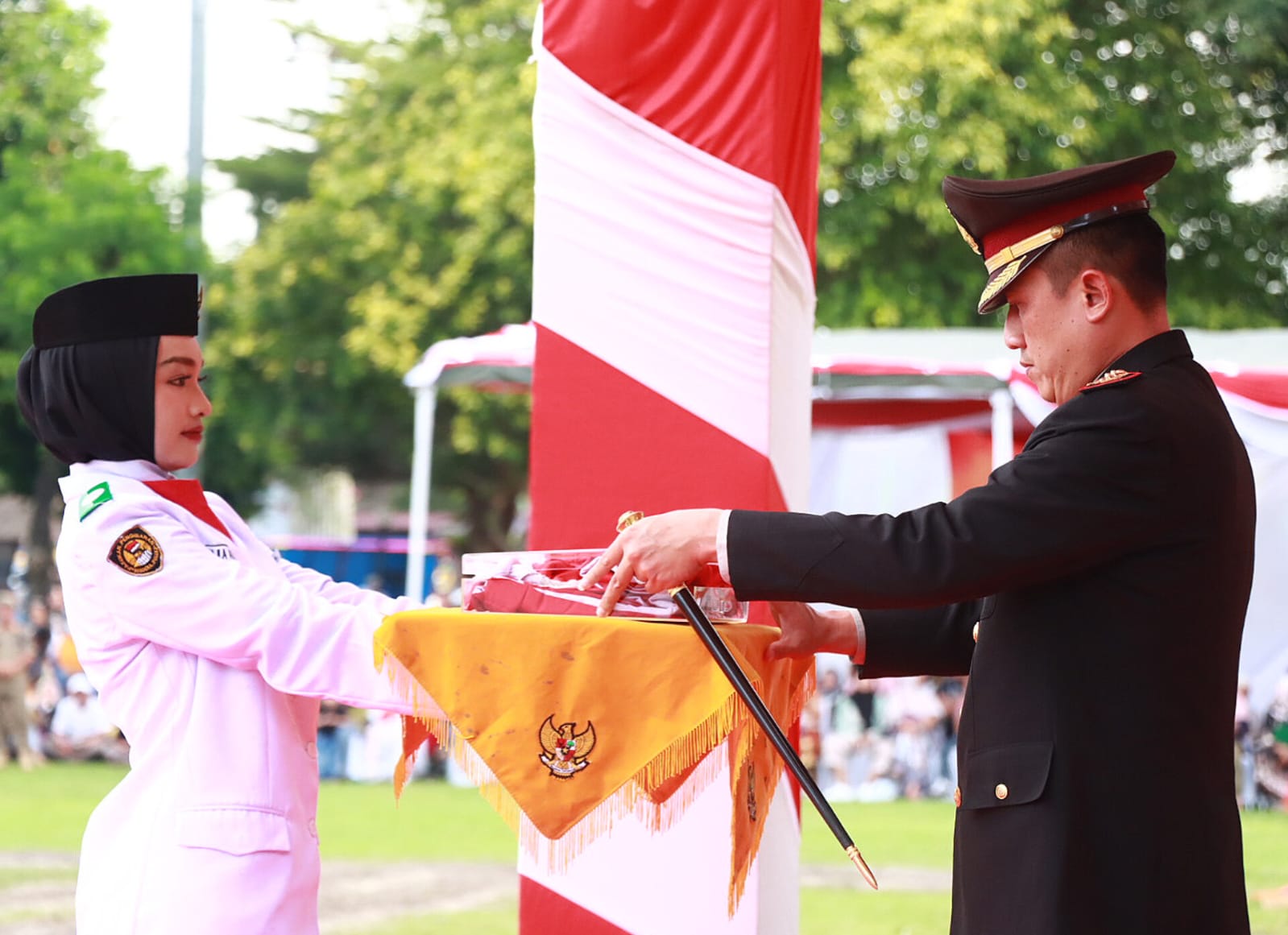 Pada Upacara Penurunan Bendera, Kapolres Binjai menerima bendera sang merah putih dari pembawa bendera paskibraka yang dikibarkan pada pagi hari saat upacara detik detik peringatan Proklamasi.